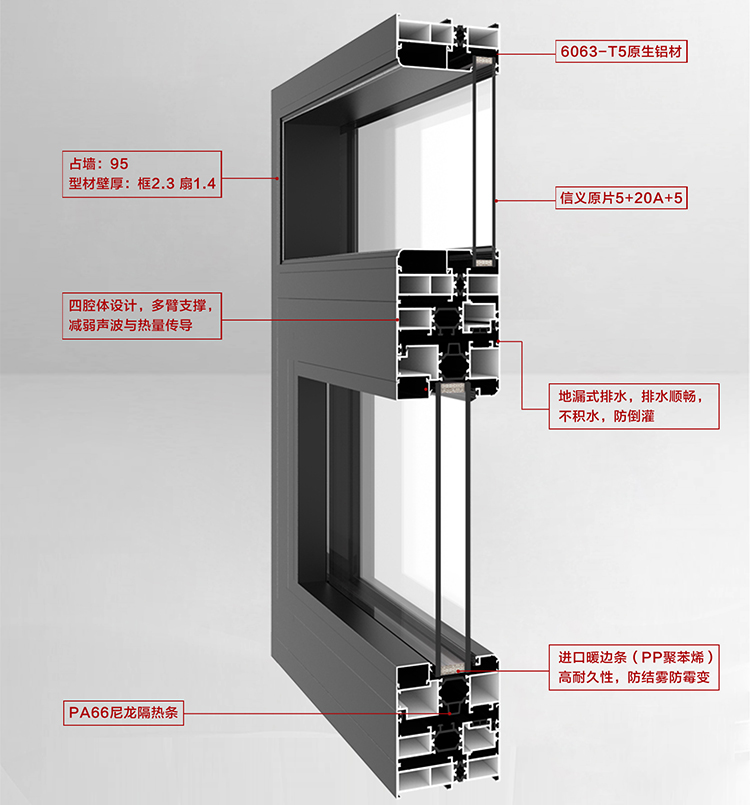 6063-T5原生鋁材 占墻:112mm 框:2.3mm 扇:1.4mm